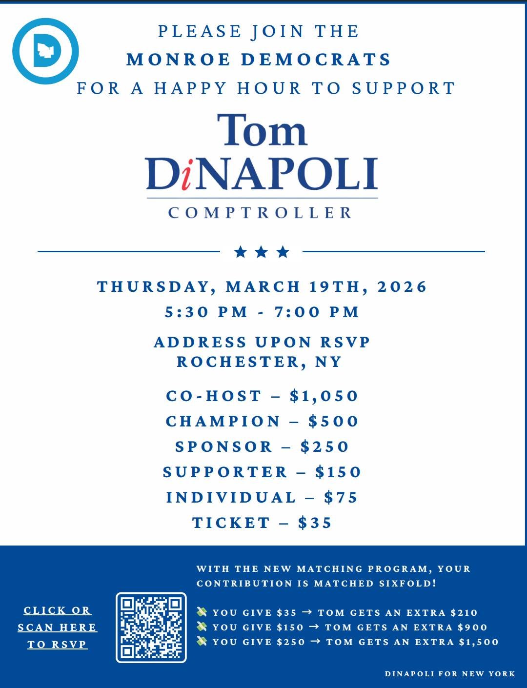 Monroe County Democrats Event: John will be attending an event on March 19th for a happy hour event with New York State Comptroller, Tom DiNapoli, alongside the Monroe County Democratic Committee. CLICK THE IMAGE BELOW for more information, and stay tuned for updates!